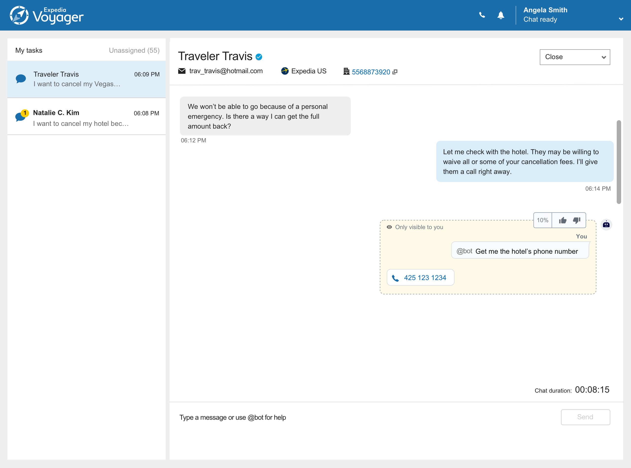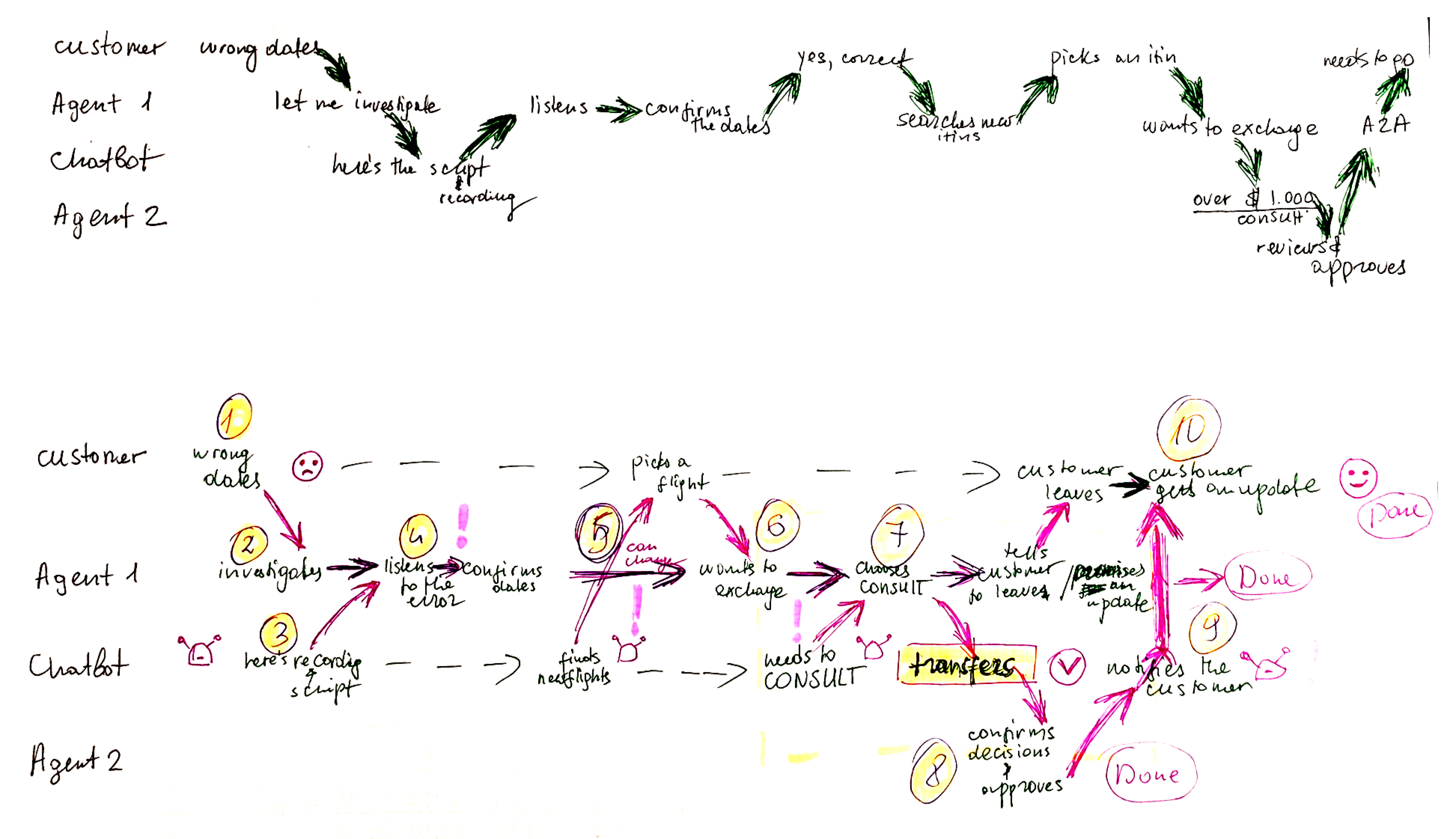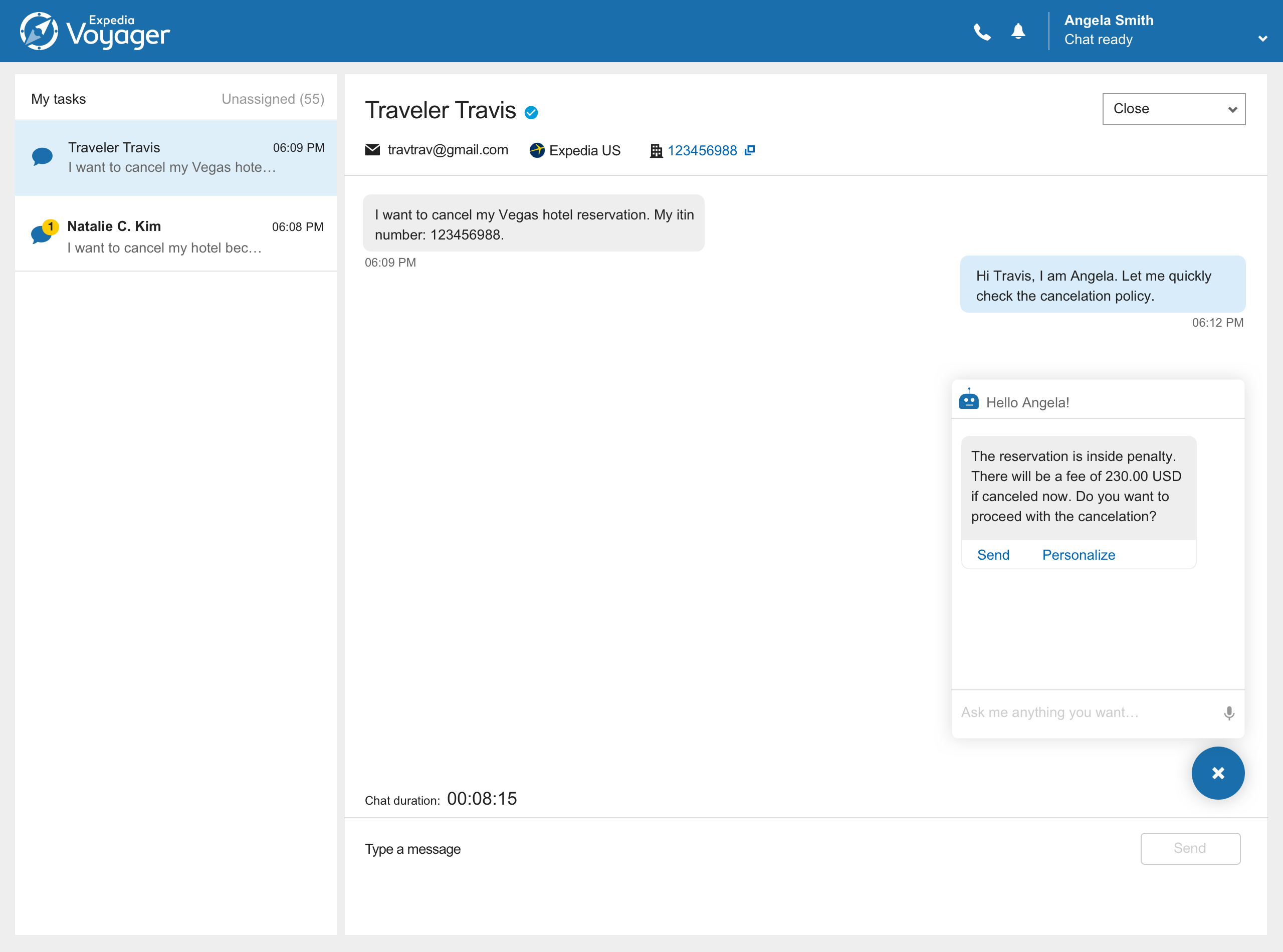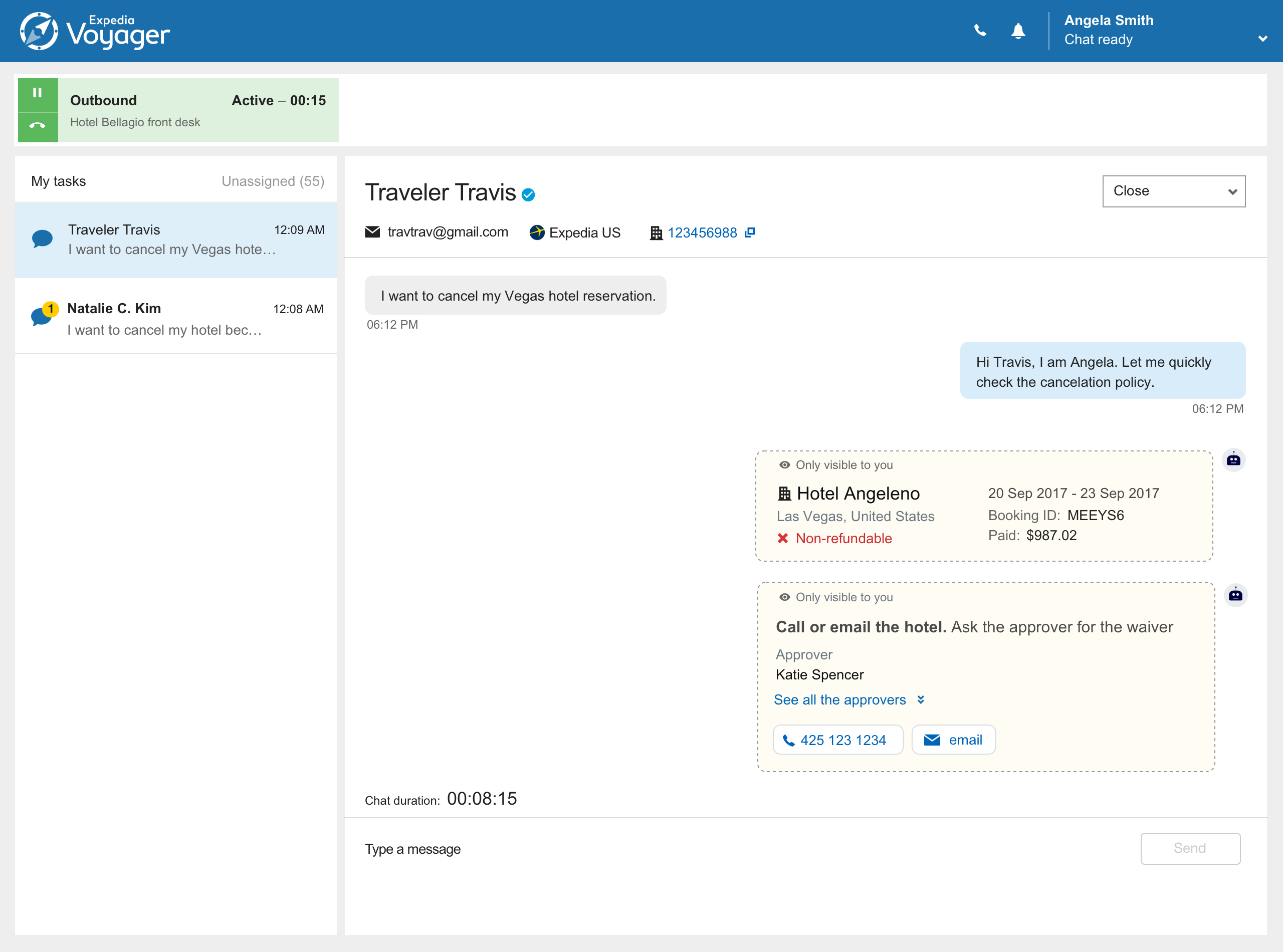 This design exploration allows for carefully crafted agent responses while receiving the right amount of information about the booking and the next best step to take.
