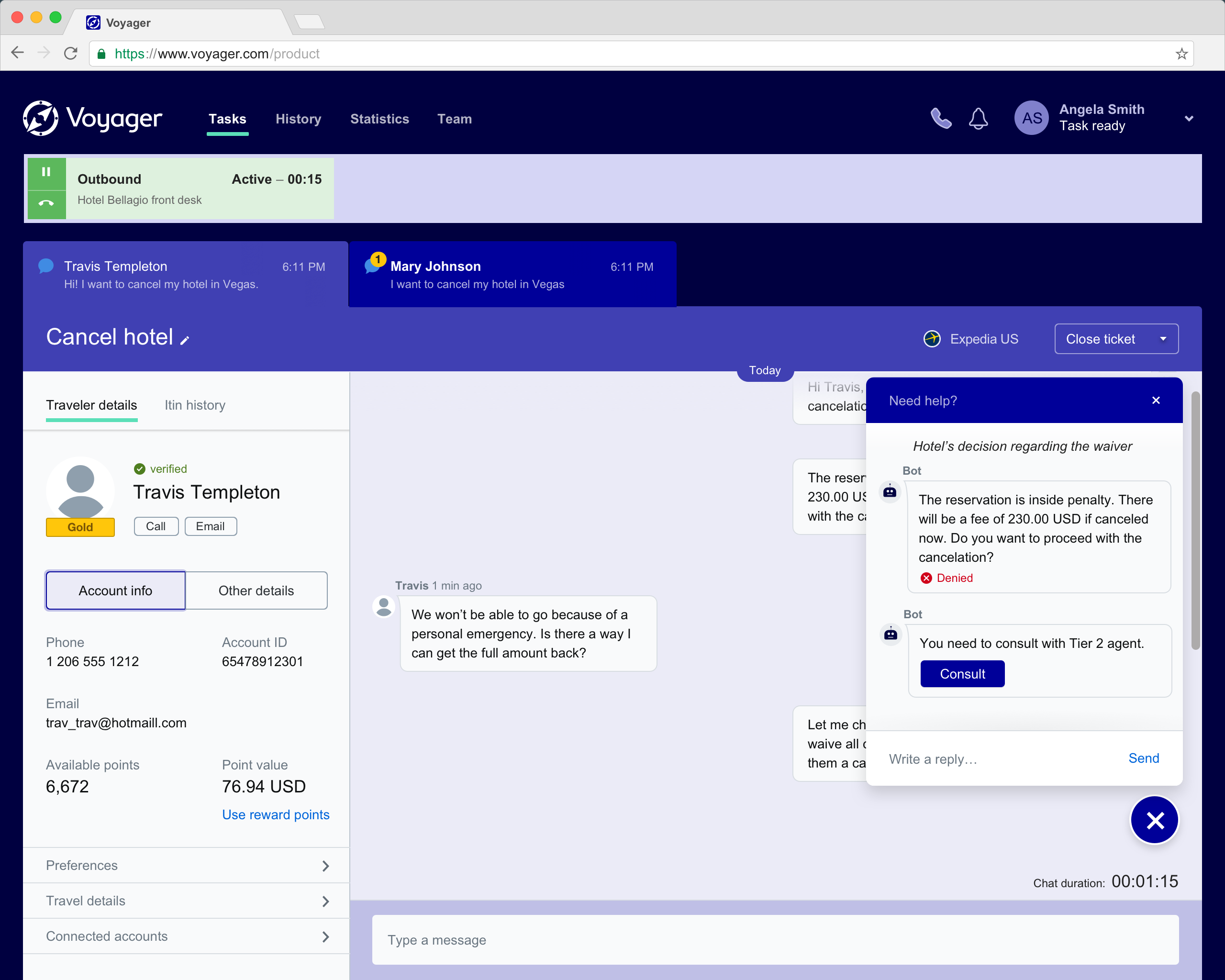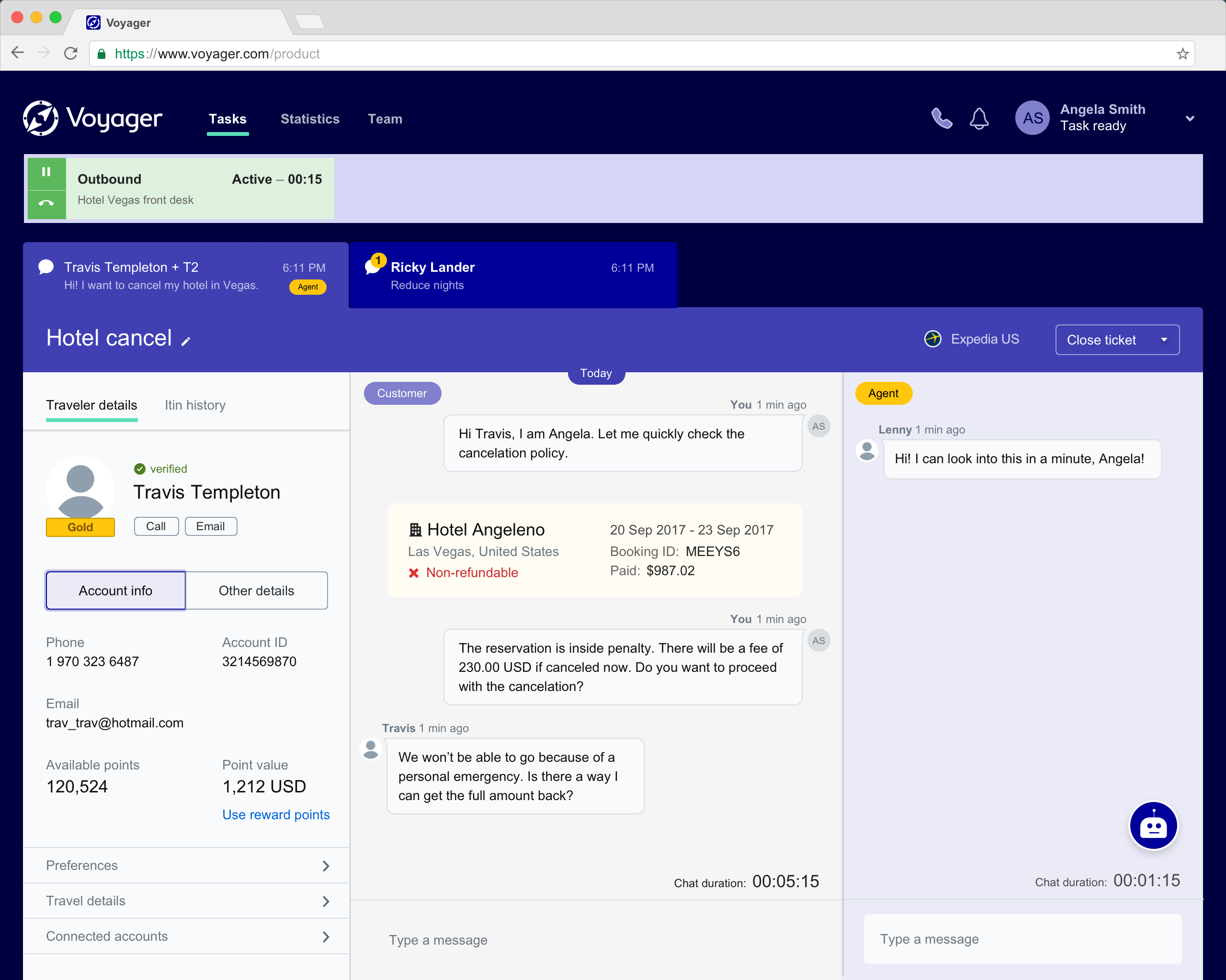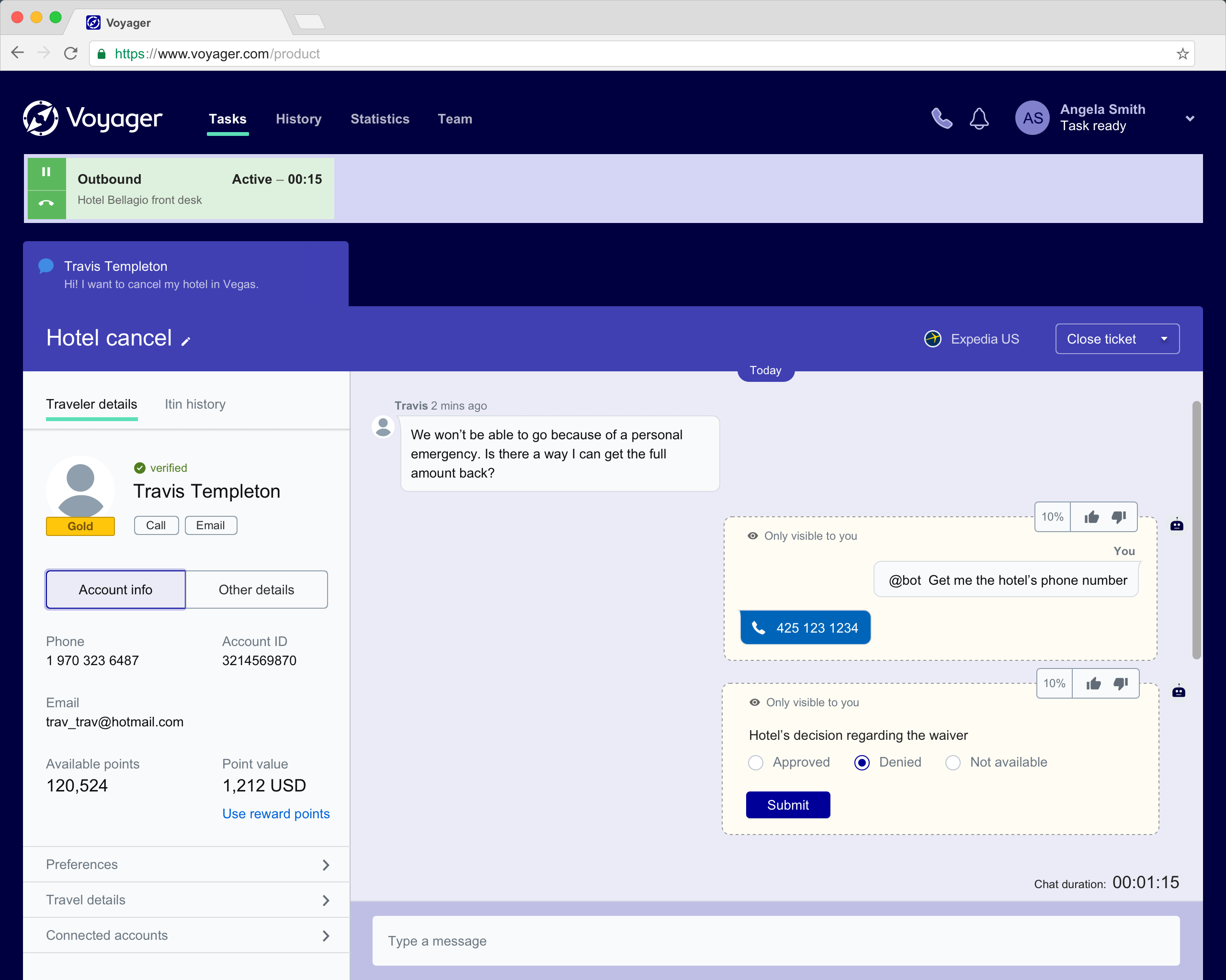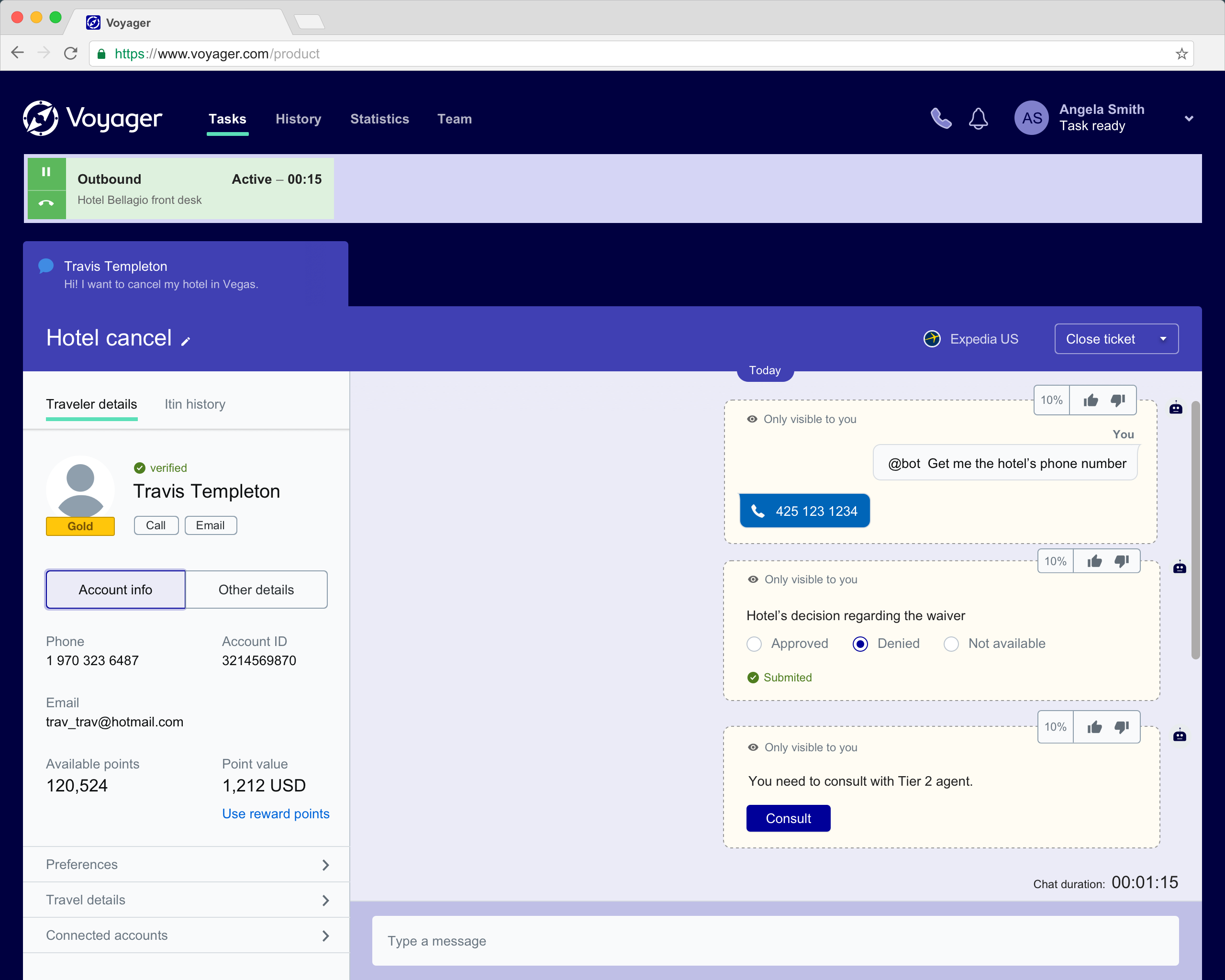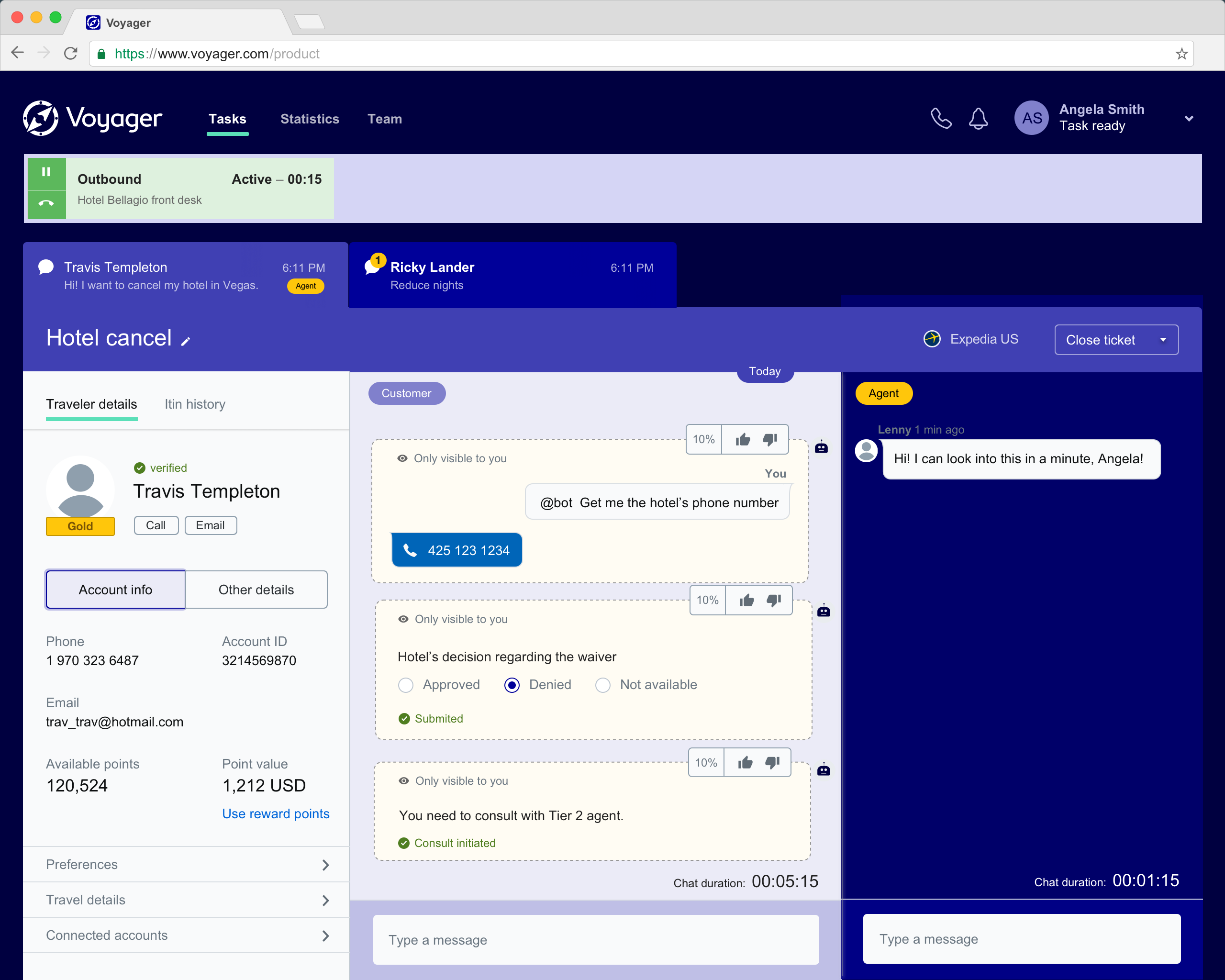 This design exploration allows for carefully crafted agent responses while receiving the right amount of information about the booking and the next best step to take.