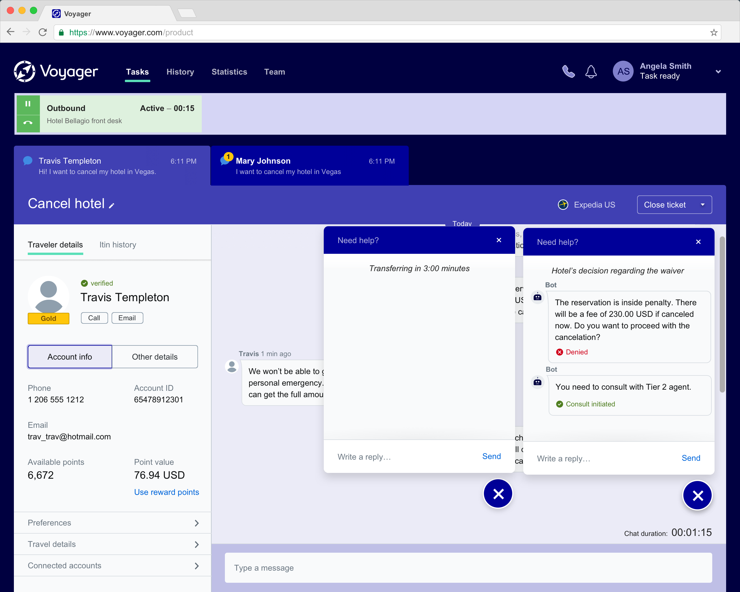 Before I joined the team, they had explored two ways to engage with an agent. This virtual assistant model assists the agent via a floating bot icon in the bottom right. This was the model I started to integrate escalations/transfer work into.
