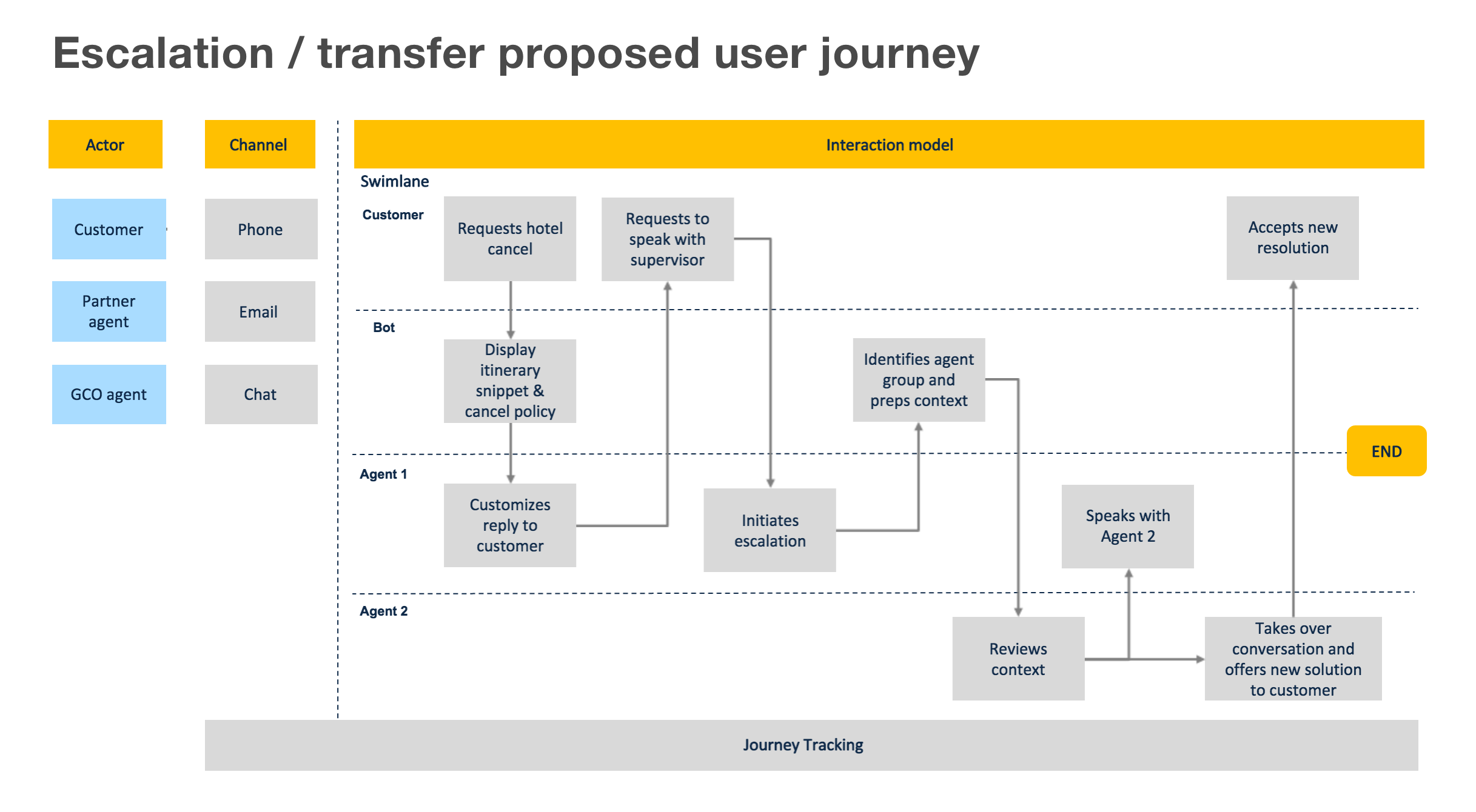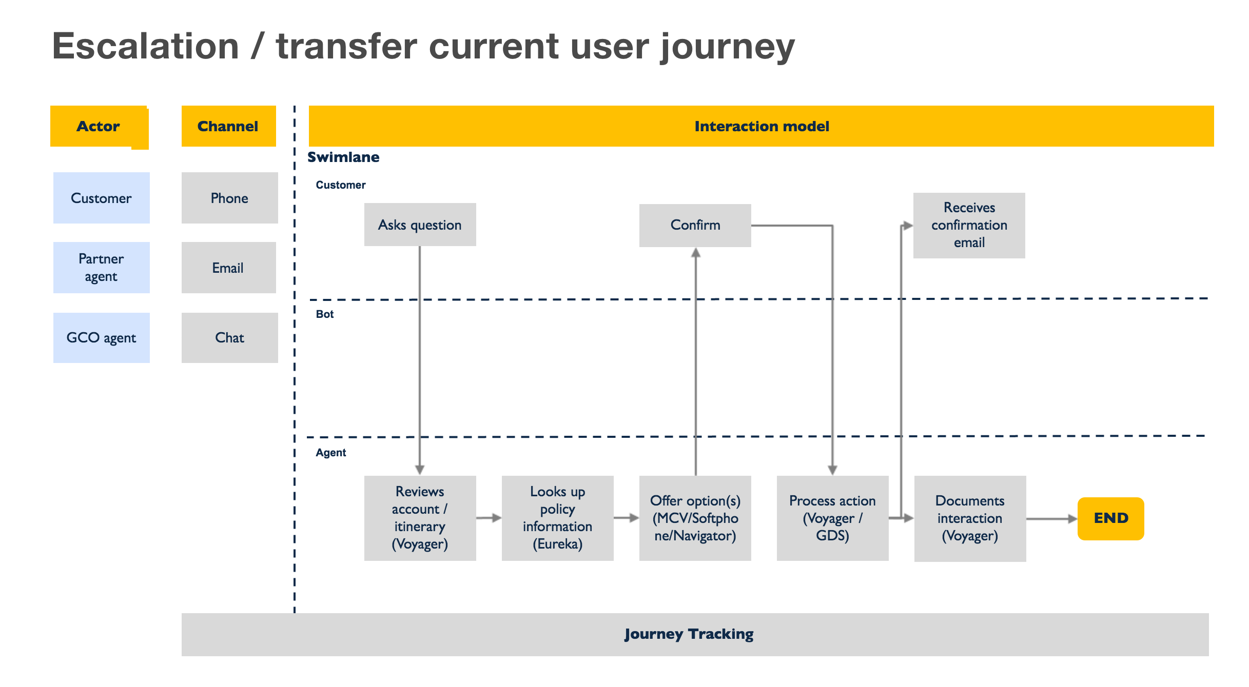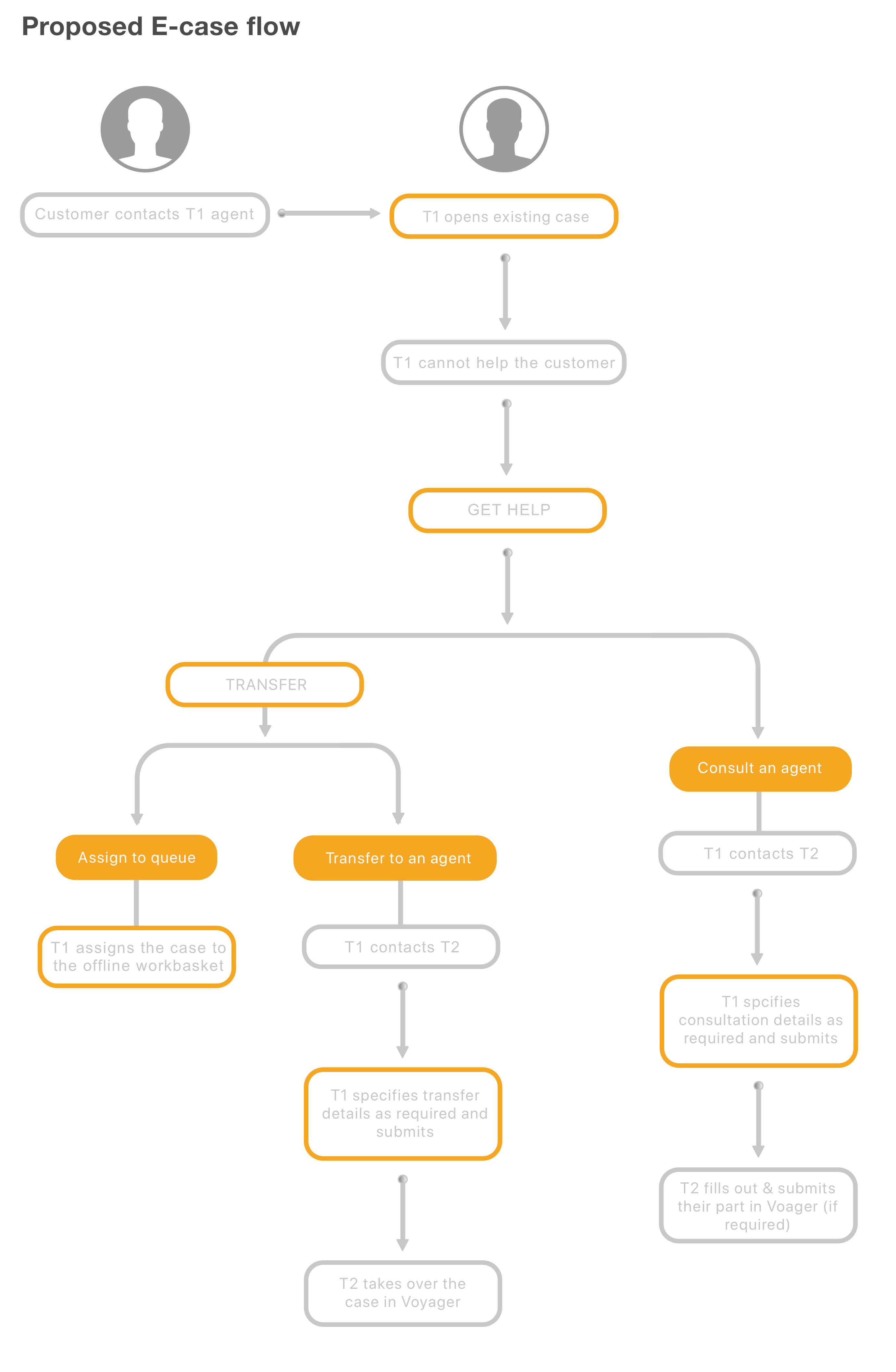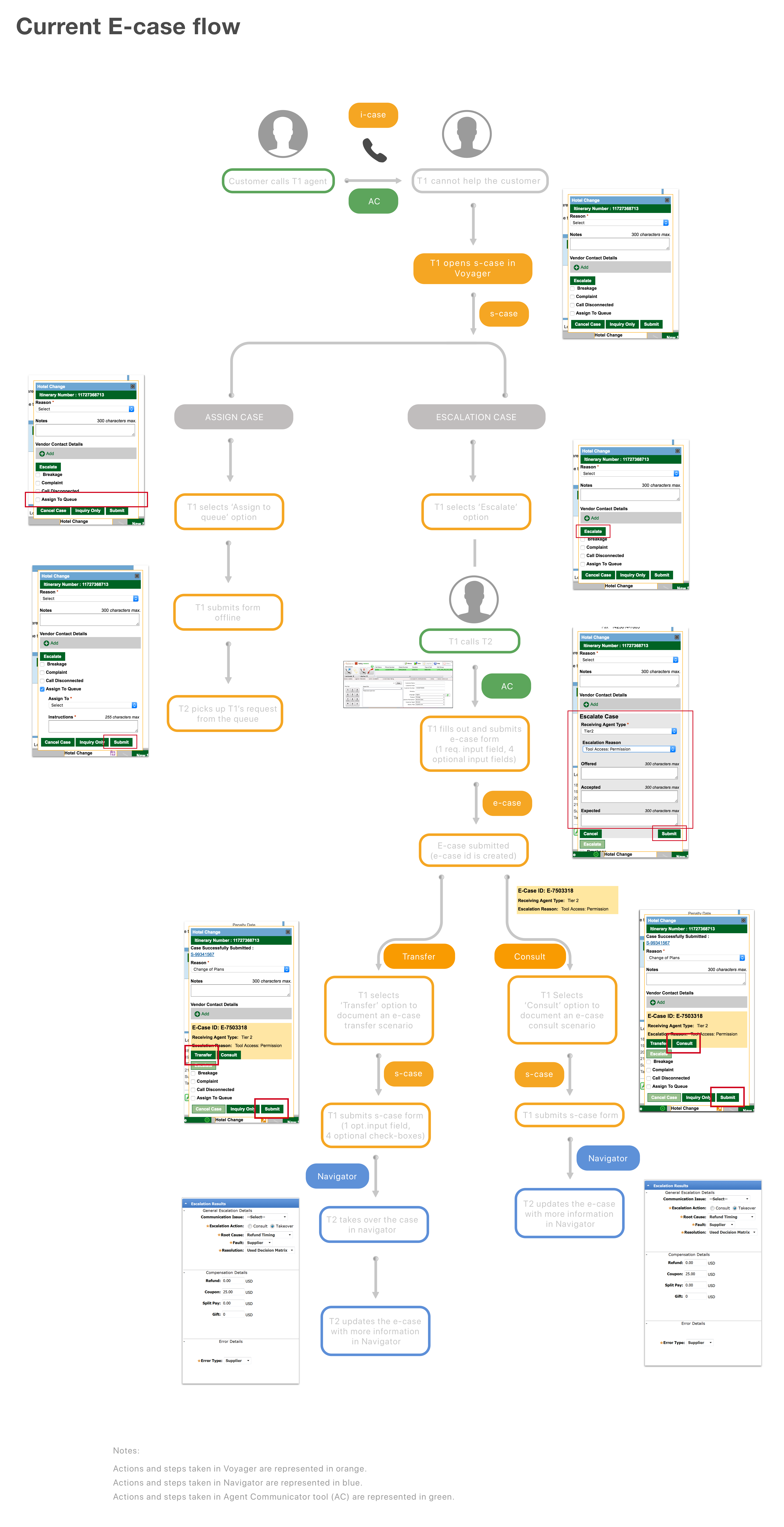 I put together flow diagrams to illustrate the old and the new escalation and transfer process and journey map. Having diagrams always helps when talking with the stakeholders and cross-functional teams. These diagrams also helped when coming up with the use case scenarios later in the process.